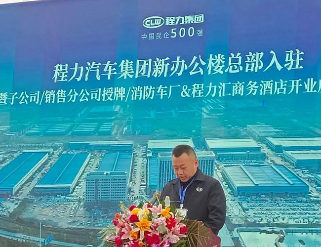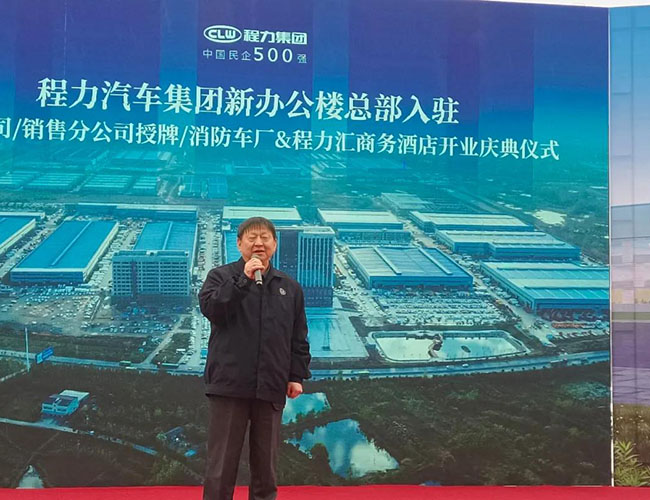 在程力集團新廠辦公大樓總部入駐慶典會上,集團總經(jīng)理程阿羅為程力消防車公司總經(jīng)理汪東洋,舉行了消防器材廠開業(yè)授牌儀式,汪東洋總經(jīng)理作了表態(tài)和發(fā)言。